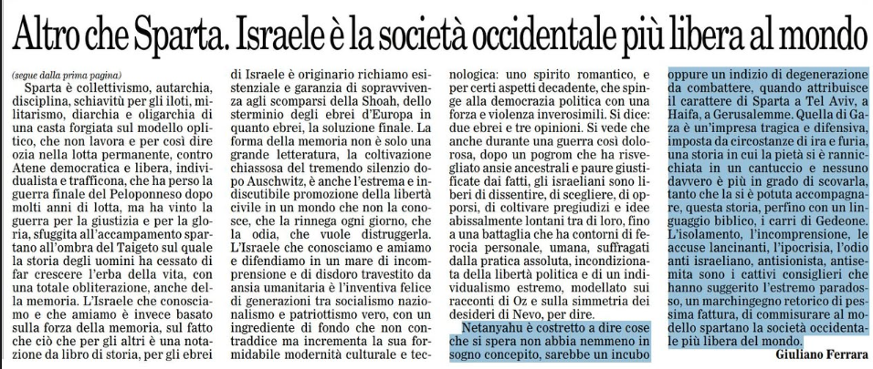 …parola di Giuliano Ferrara sul Foglio di ieri. L’ennesima dimostrazione (come se non bastassero le odiose e spudoratamente menzognere veline vomitate ogni giorno dal Riformista) che peggio di Netanyahu e dei suoi fanatici ministri ci possono essere solo i loro seguaci europei e americani perinde ac cadaver (purché il cadaver sia quello degli altri, beninteso).